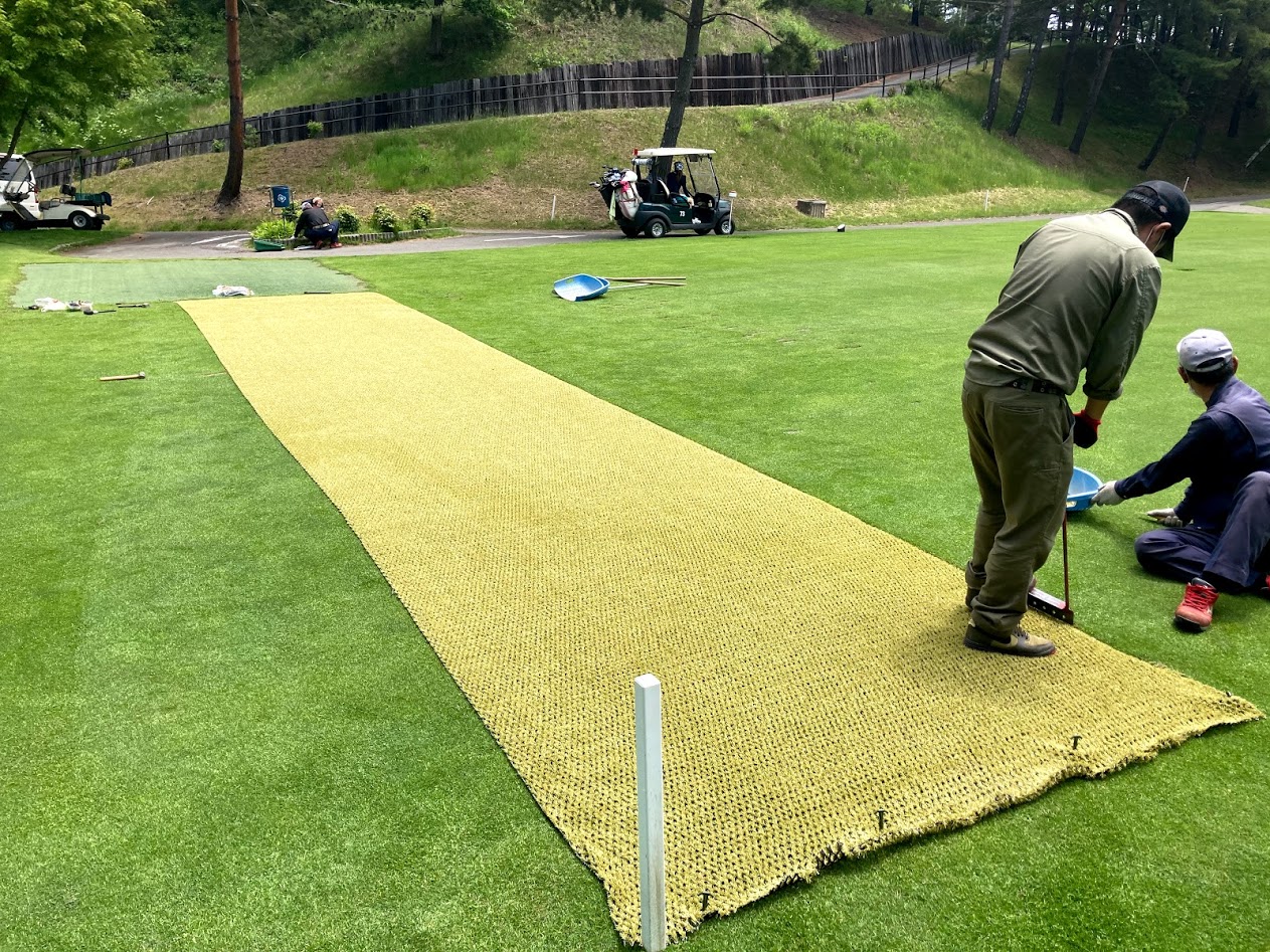 17番ティイングエリアは面積が狭く、踏圧やディボッドなどの回復に時間がかかり痛みが激しくなります。そのため人工芝を採用しておりましたが、この度カバーローン(ハイブリット芝)を施工致しました。