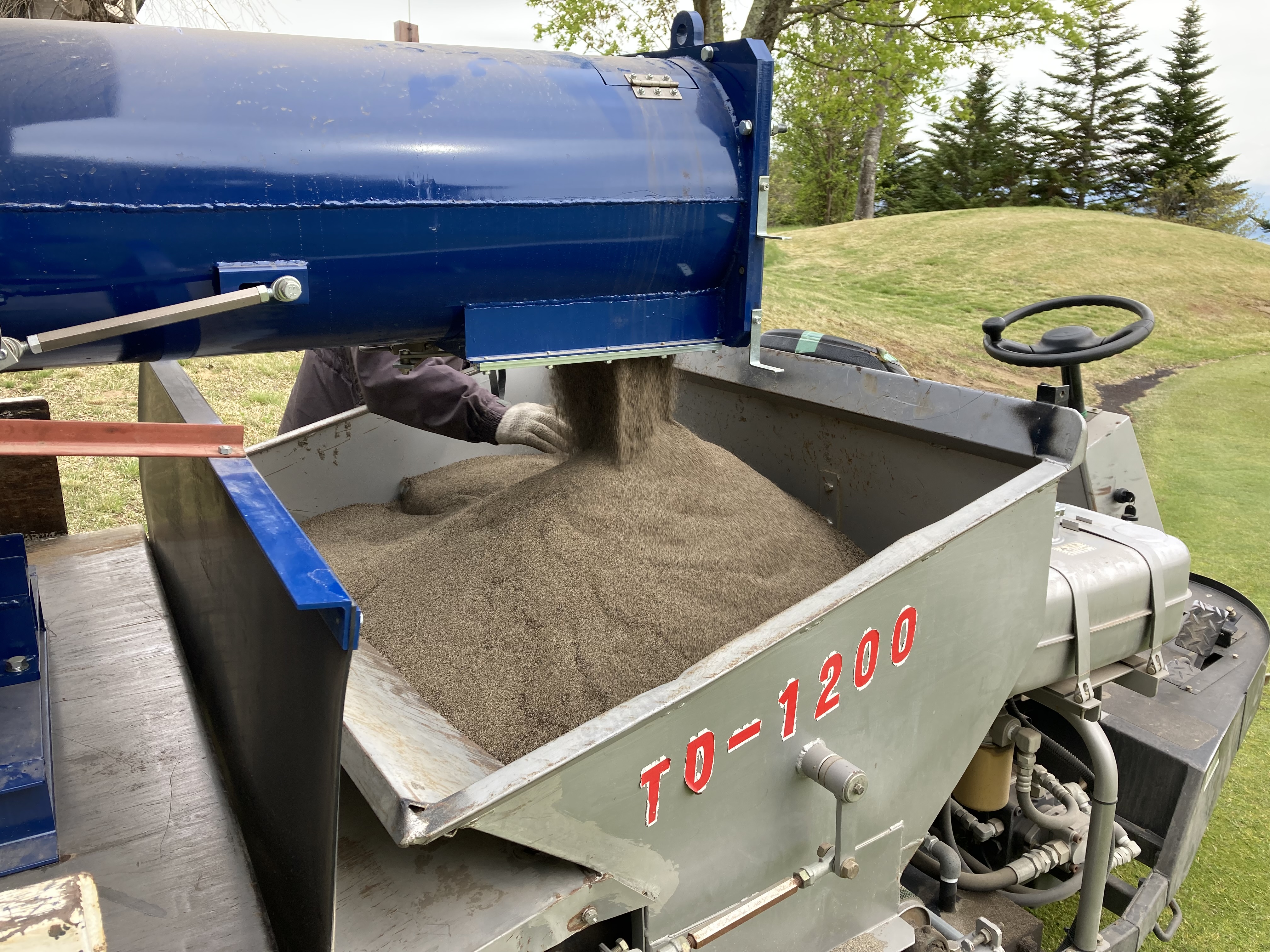 ③目砂散布機にてグリーン表面に均一に肥料と種を混ぜたきめ細かな乾燥砂(粒径1mm以下)を散布