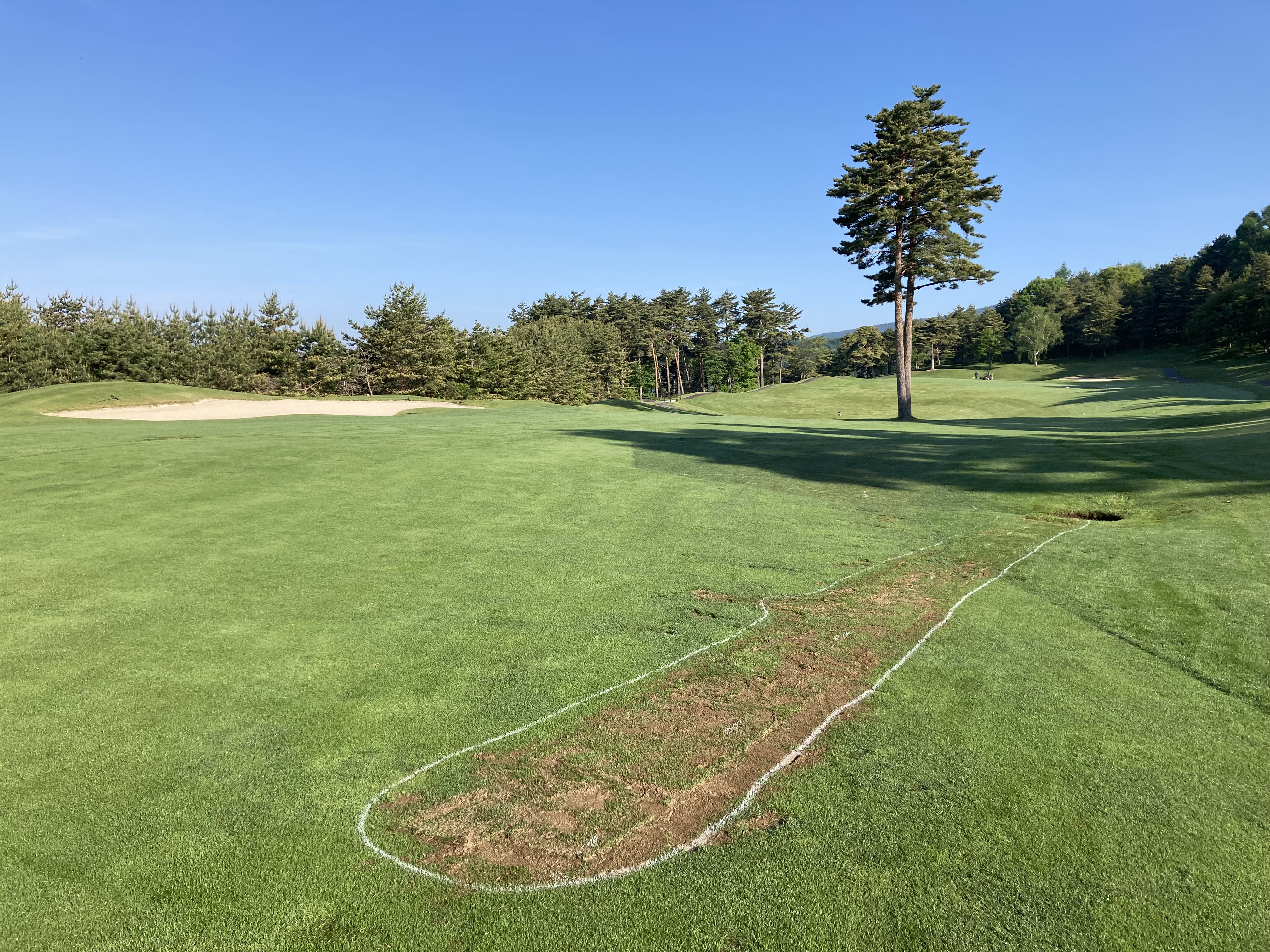 工事箇所および芝の養生箇所は、修理地とし青杭および白線にて示しております。カートでの進入およびプレーはお控えいただき、ボールが入った場合は無罰にて救済を受けてください。