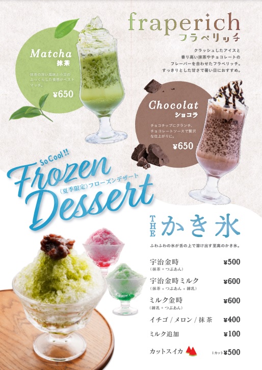 かき氷・フラペリッチ・チョコレートパフェ・アフォガードなどなどデザートメニューも充実の品揃え。