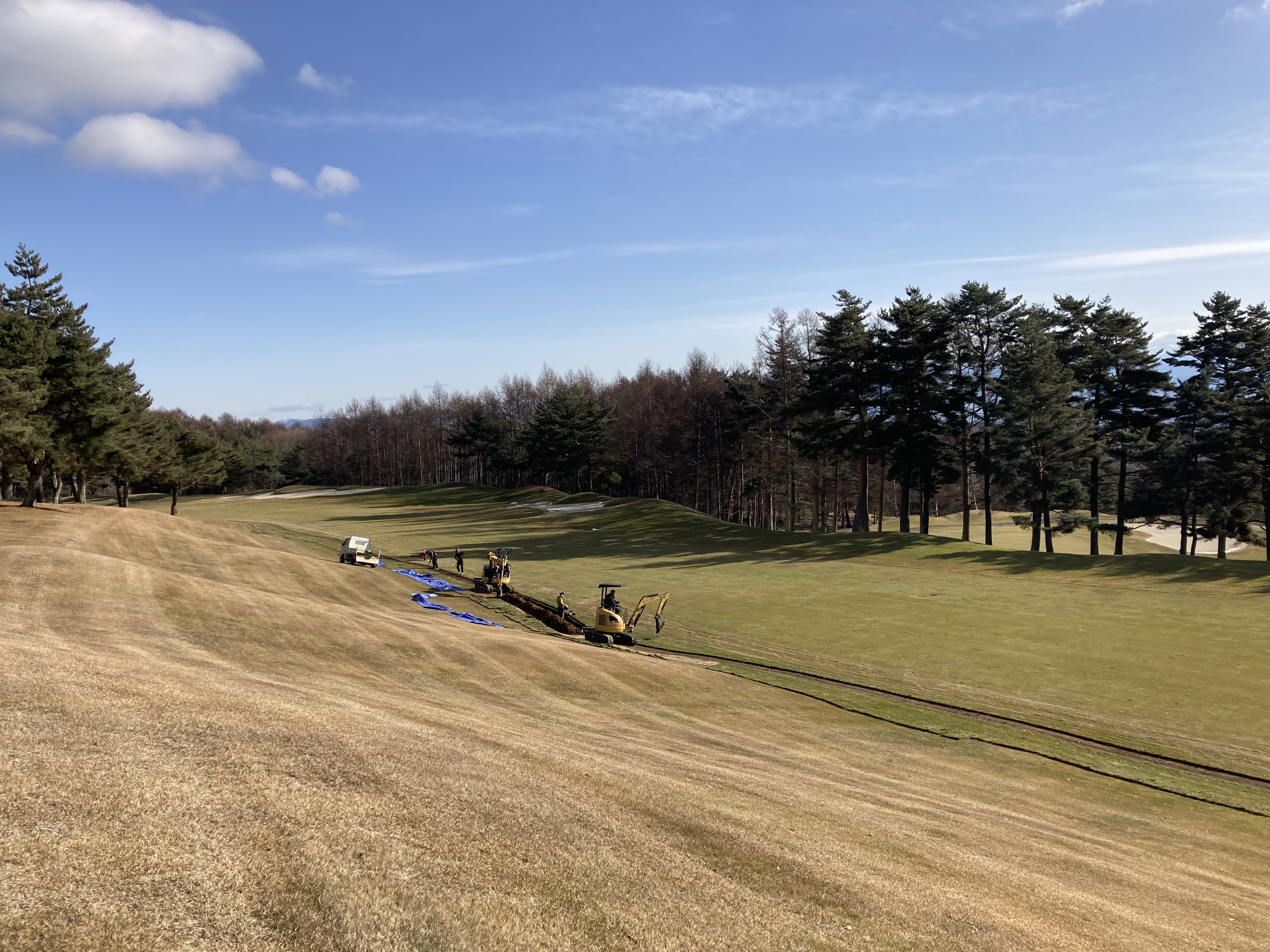 本年も冬期クローズ期間を利用し、コースコンディションの回復・向上に向け、昨年に引き続き暗渠排水管・カート道路設置・自動散水システムの新設工事を行っております。