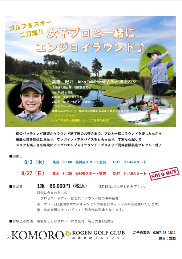 ご好評につき、下記開催予定の女子プロ同伴ラウンドは完売いたしました。